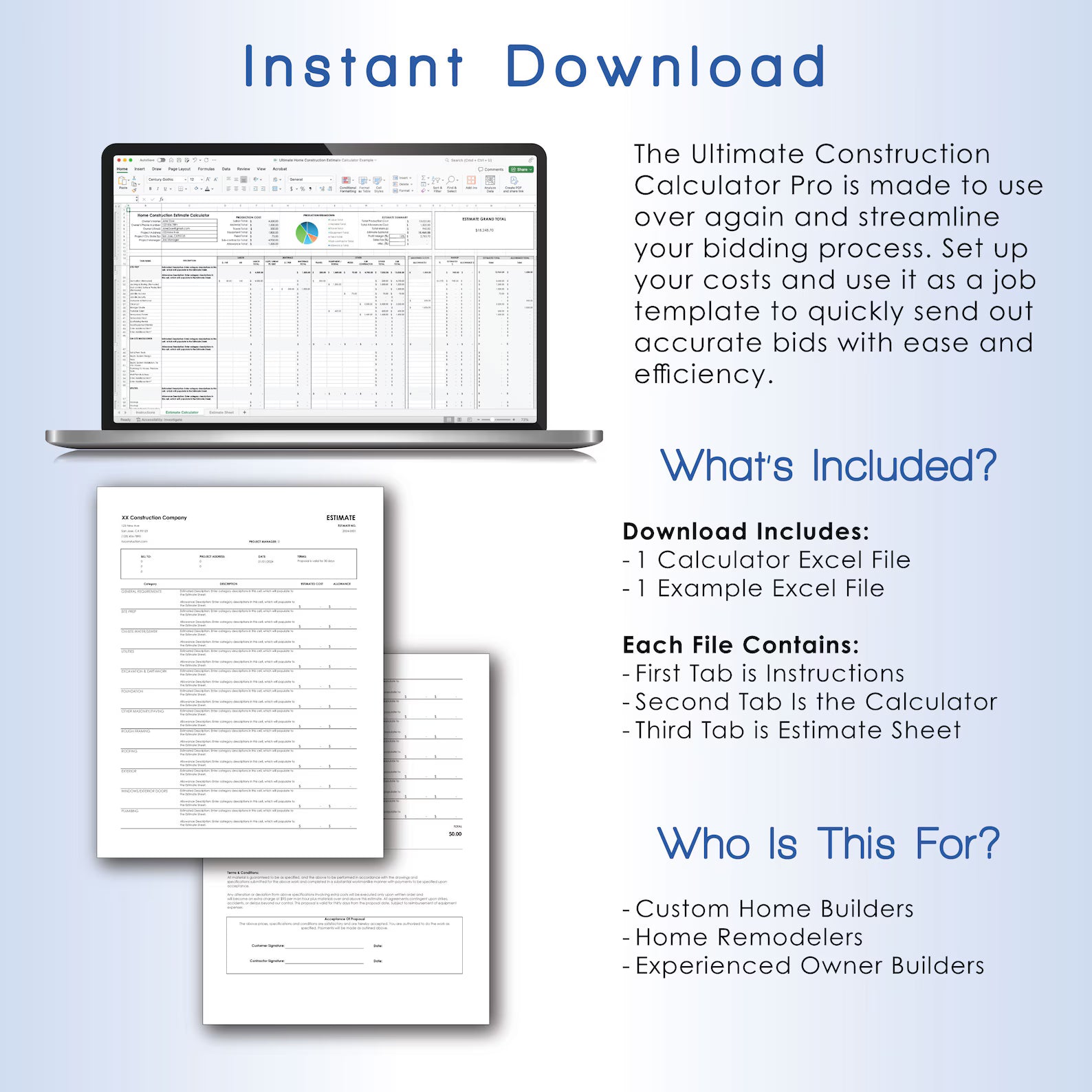 Construction Estimate Calculator Pro, Digital Printable Estimate Builder Template, Contractor Estimate Spreadsheet & Project Management
